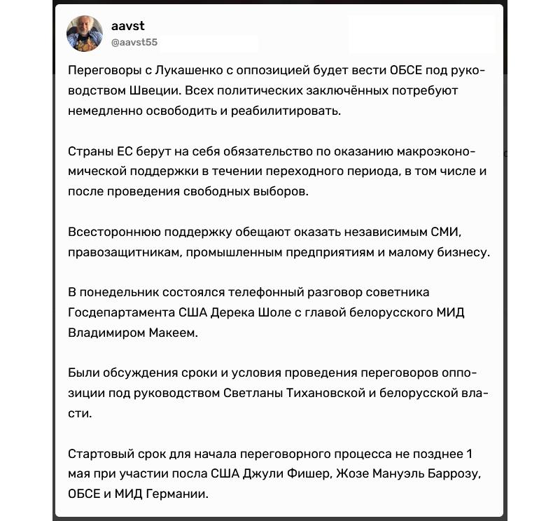 «Переговоры Лукашенко с оппозицией будет вести ОБСЕ под руководством Швеции. Всех политических заключенных потребуют немедленно освободить и реабилитировать», — цитирует ukraina.ru сообщение главреда «Эха Москвы». Затем, ссылаясь на оригинал, раскрывает другие подробности предстоящего события. Мол, страны ЕС возьмут на себя обязательство по оказанию макроэкономической поддержки в течение переходного периода, в том числе и после проведения свободных выборов. Всестороннюю поддержку обещают оказать независимым СМИ, правозащитникам, промышленным предприятиям и малому бизнесу.