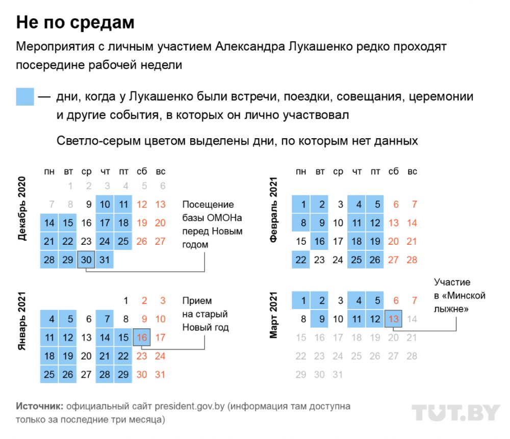 Что касается графика, то совпадений точно нет. Еще в марте 2021 года TUT.BY подробно изучал расписание политика. Авторы пришли к выводу, что среда — «самый свободный день рабочей недели», четверг — «время встреч», а пятница — день рабочих поездок и встреч с коллективами.