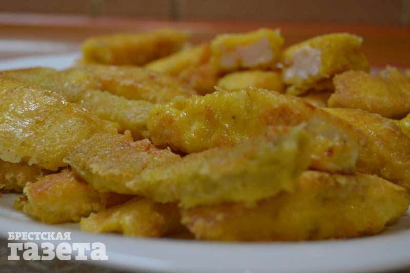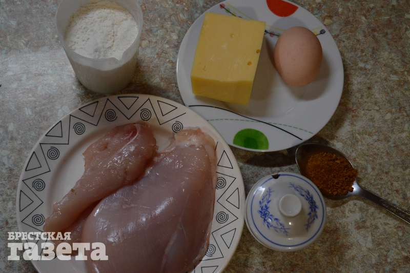 Надо: 500 г куриного филе, 200 г сыра, 2 яйца, 100 г муки, соль, приправы по вкусу, растительное масло для жарки.