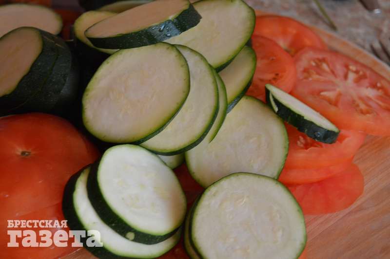 Соус положите на дно формы для запекания. Оставшиеся помидоры и цукини нарежьте кружочкамии и, чередуя, выложите на соус.