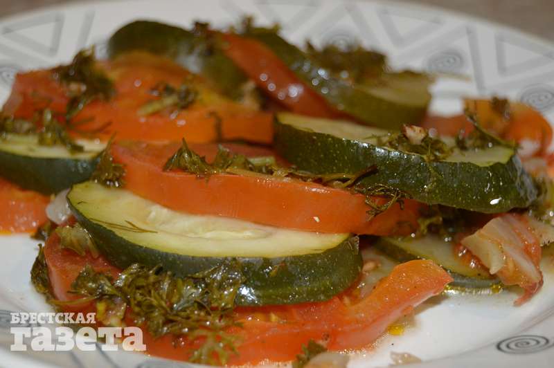 Надо: 1 цукини, 6 помидоров, 1 болгарский перец, 1 средняя луковица, 4 зубка чеснока, укроп, петрушка, оливковое масло, соль, сахар, молотый перец.