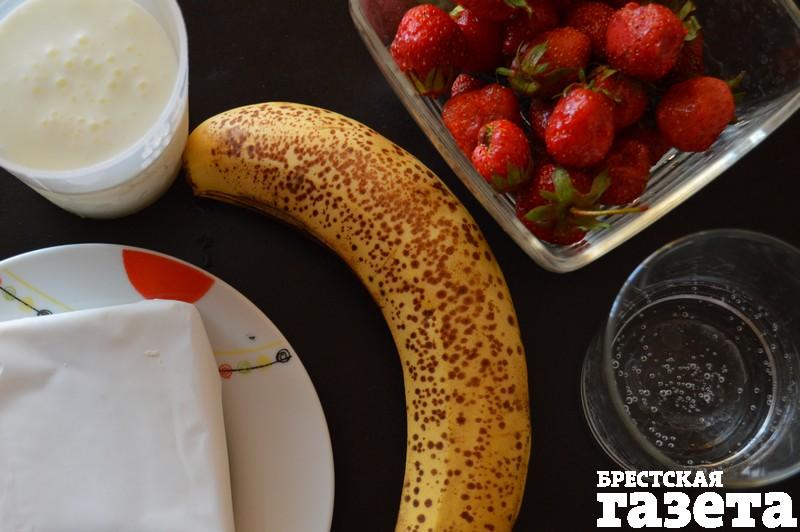 Надо: 180 г нежирного творога, 150 мл кефира, 50 мл минеральной воды, 150 г клубники (свежей или замороженной), 1 банан, орехи, изюм по вкусу.