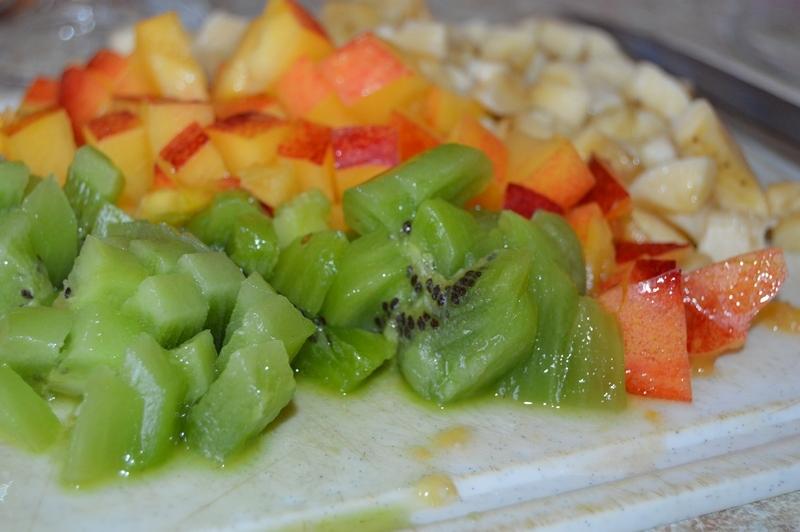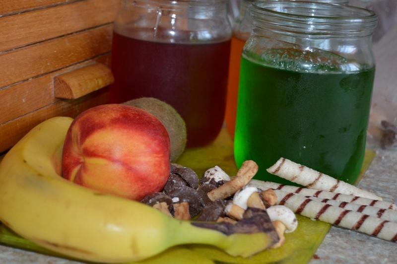 Надо: 4 пачки полуфабриката для желе (разных вкусов), 1 нектарин, 1 банан, 1 киви, печенье «Грибочки», вафельные трубочки.