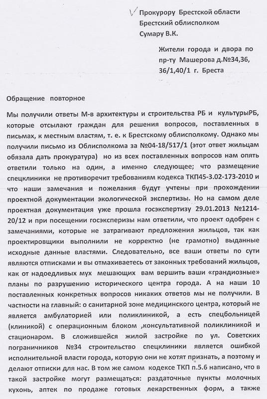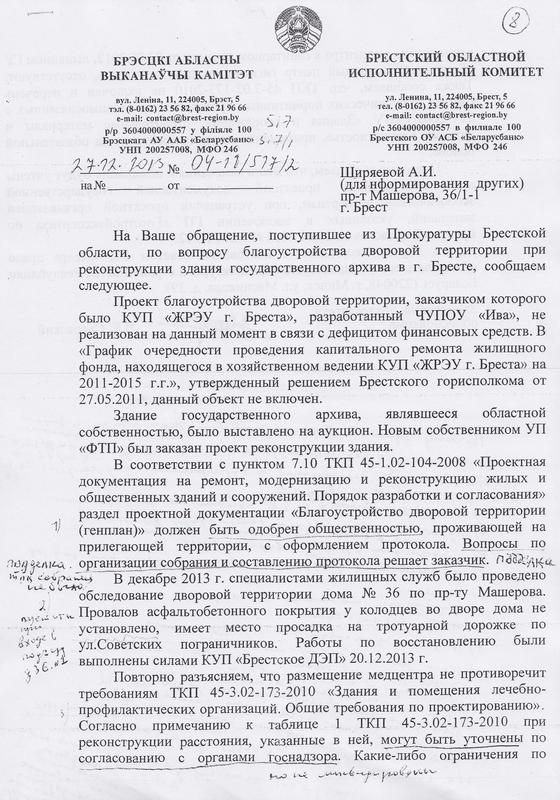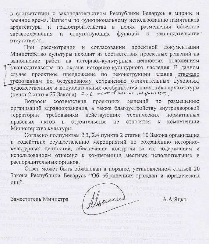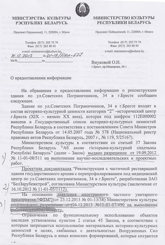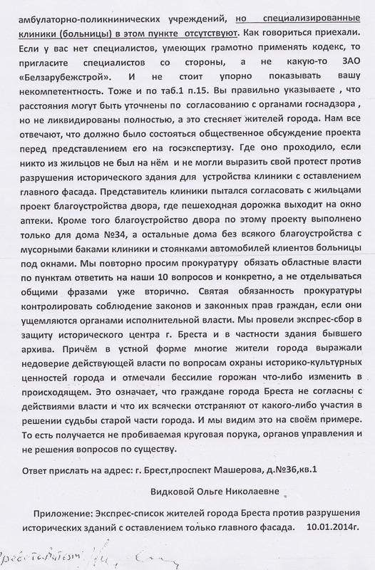 Ирина Лавровская сообщила, что 11 февраля ею отправлены заявления в Министерство культуры и в прокуратуру, где она просит срочно остановить уничтожение архитектурного ансамбля, отозвать разрешение на проведение работ, пересмотреть проект реконструкции здания по ул. Советских Пограничников, 34, выполненный ЗАО «Белзарубежстрой».