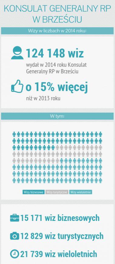 Генконсульство в Бресте выдало в 2014 году 124 148 виз (рост по сравнению с 2013-м — 15%). Среди них 15 171 деловая виза, 12 829 туристических, 21 739 многолетних.