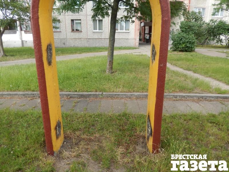 Во дворе дома №1/2 бетонные арки утратили свое былое предназначение, ведь их металлические перекладины обрезаны. А вот глобус и еще некоторые объекты детской площадки удалось спасти.