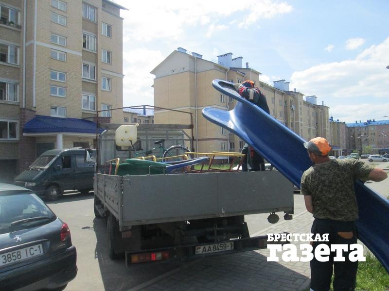 Первое же утро после Дня защиты детей не было добрым для маленьких брестчан и их родителей из микрорайона Березовка. По словам жильцов, 2 июня примерно в 11 часов на детской площадке дома №100А по ул. Мошенского появились какие-то люди и начали ее опустошать, буквально вырывая из земли все ее оборудование. А потом они сложили все в грузовики и трактор, чтобы вывезти со двора.