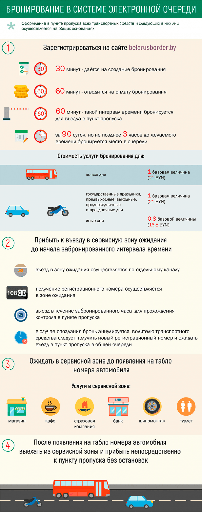 Бронирование времени въезда в пункт пропуска на одно и то же транспортное средство несколько раз не допускается. Добавить еще одно предварительное бронирование для того же транспортного средства можно только после его выезда из зоны ожидания в пункт пропуска или отмены имеющегося бронирования времени въезда в пункт пропуска. Пользователи, зарегистрированные как физические лица, могут выполнить не более одного бронирования в сутки.