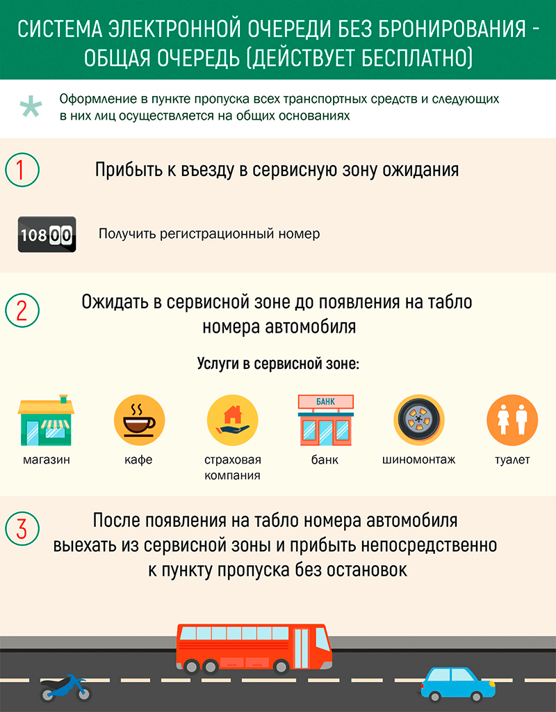Прибыть в зону ожидания надо до начала времени бронирования. Въезд в нее осуществляется по отдельному каналу. Там вы получите регистрационный номер и останетесь ждать, пока номер вашего авто не появится на табло. Кстати, в сервисной зоне есть магазин, кафе, страховая компания, банк, шиномонтаж и туалет. После появления на табло номера вашего автомобиля следует выехать из сервисной зоны и прибыть к пункту пропуска без остановок.