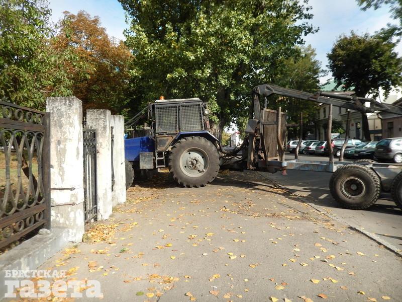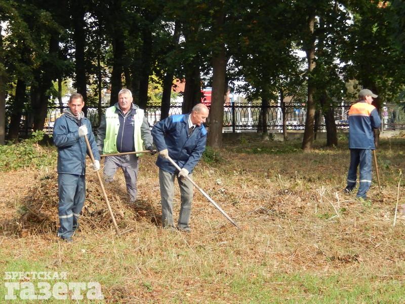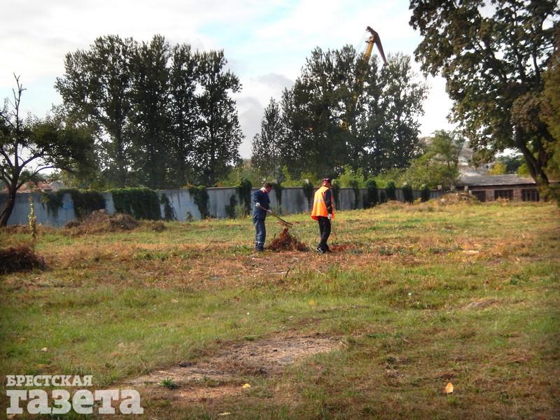 Когда корреспондент «БГ» пришла на угол ул. Ленина и проспекта им. Машерова, то увидела, что обычно закрытые ворота, делавшие территорию, заросшую разного рода растительностью, недоступной, распахнуты. Неподалеку от них работали люди в спецодежде, сгребая в кучи листву, ветки, срубленную поросль. Обратившись к одному из них, узнала, что трудятся здесь работники ПКУП «Коммунальник», а он исполняет обязанности бригадира.