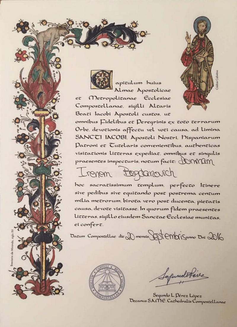 — В переводе с испанского означает «путь Святого Иакова». Этим путем шел апостол Иаков, чтобы проповедовать христианство на Пиренейском полуострове. Есть два пути — португальский и французский. Пешие паломники должны пройти не менее 100 км пути, велосипедисты — не менее 500.