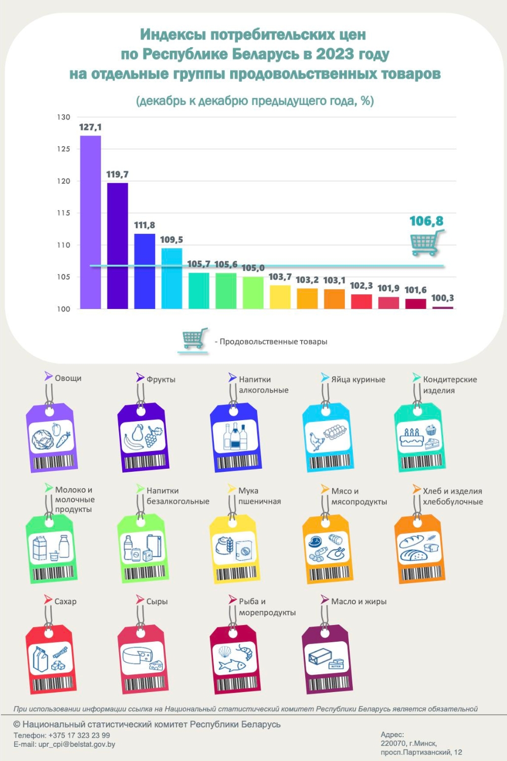 По данным Белстата, в декабре 2023 года в разрезе отдельных групп продовольственных товаров больше всего подорожали овощи — на 27,1% по сравнению с декабрем 2022 года. Фрукты стали дороже на 19,7%, а алкогольные напитки — на 11,8%.