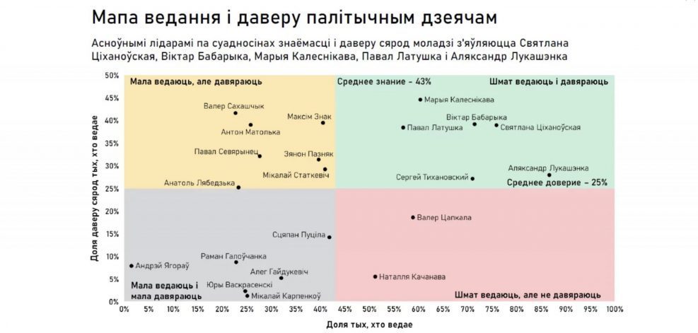 - По соотношению знаний и доверия среди молодежи лидируют практически только противники действующей власти. Политические организации: Офис Светланы Тихановской, Полк Калиновский, Киберпартизаны и ByPol. Политики: Светлана Тихановская, Виктор Бабарико, Мария Колесникова, Павел Латушка и Александр Лукашенко.