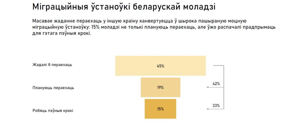 - Отношение к миграции достаточно распространенное: почти половина (45%) хотели бы переехать в другую страну на ПМЖ, а 15% уже предпринимают для этого конкретные шаги.