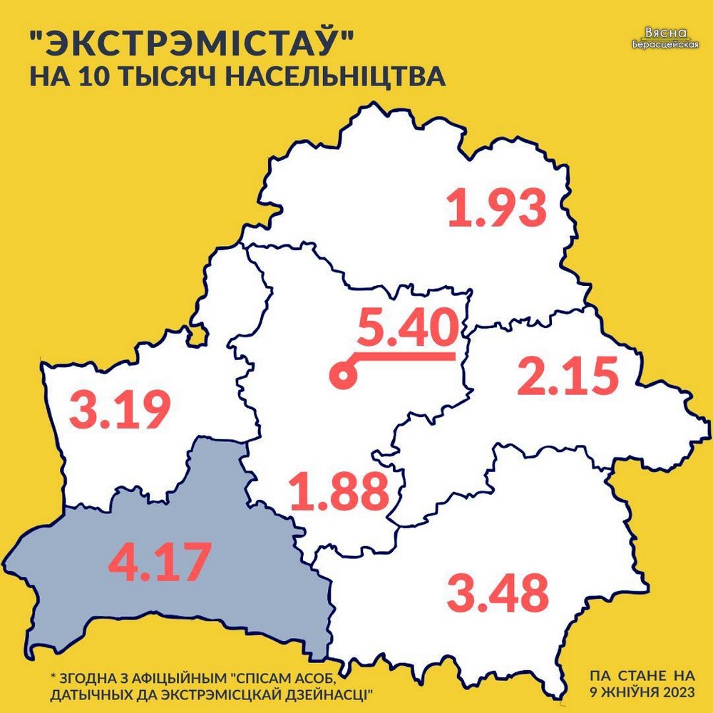 На 9 августа 2023 года в «список экстремистов» внесли 3 111 человек. 548 человек из них относятся к Брестской области. На душу населения, после столицы, в нашем регионе самый высокий показатель «экстремистов» — репрессированных в уголовном порядке.