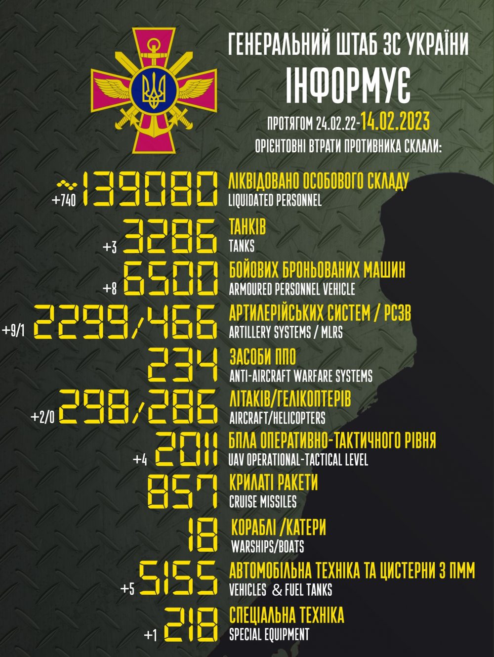 По данным Генштаба ВСУ на 14 февраля, Украина уничтожила 6 500 боевых бронированных машин армии РФ.