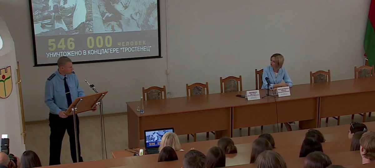 На прошлой неделе заместитель прокурора Брестской области Даниил Дерябин выступил перед студентами первого курса юридического факультета БрГУ имени Пушкина с лекцией про «геноцид беларуского народа» в годы Великой Отечественной войны. В презентации прокурора утверждается, что в лагере смерти «Тростенец» убили 546 000 человек. Эта цифра превышает официальные данные почти в 2,5 раза (206 500 человек).