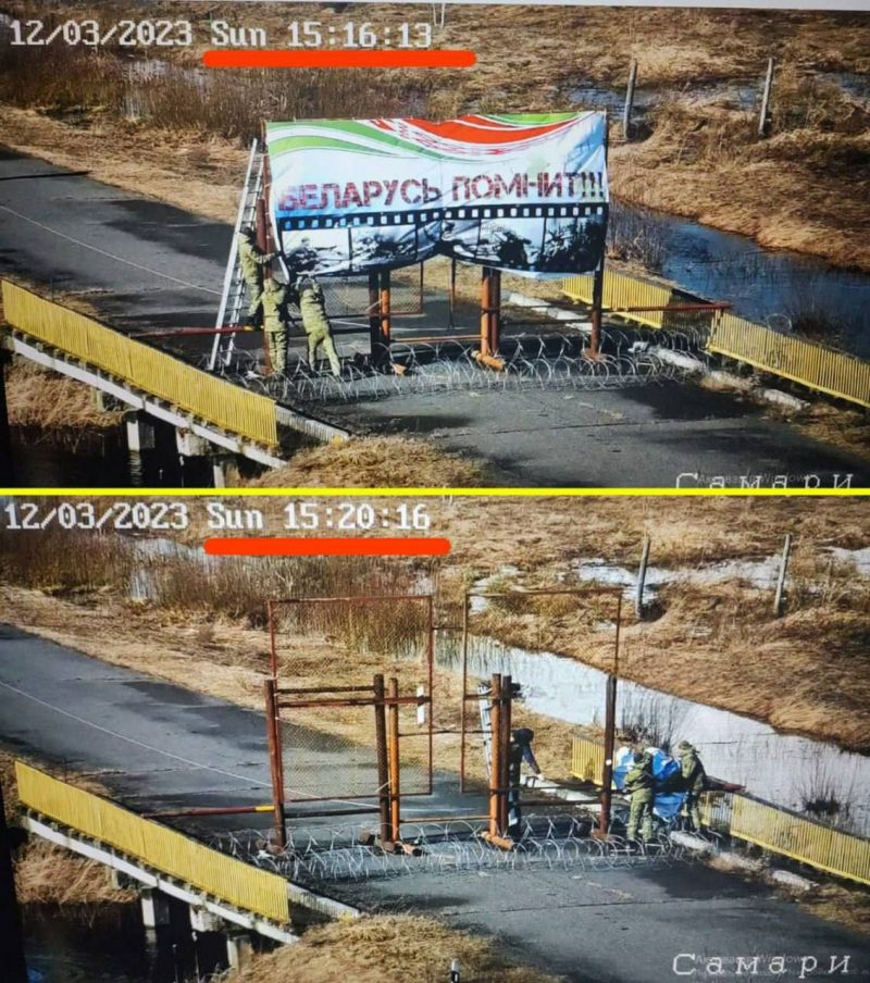 В телеграм-каналах распространилась фотография, которая, возможно, компрометирует беларуских пограничников и пропагандистов. На фото есть два скриншота с онлайн-камеры, на которых видно, что люди в военной форме снимают плакат «Беларусь помнит». Судя по данных с онлайн-камеры, происходит это 12 марта в период с 15.16 до 15.20.