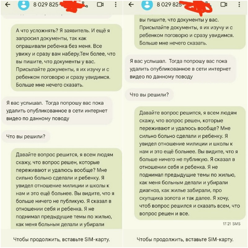 «Зачем все искусственно усложнять? Переговорили и разошлись. Если вас что-то смущает, могу подъехать к вам домой и переговорить там», — написал он в ответ на отказ отца это делать. После «милиционер» попросил удалить «опубликованные в сети интернет видео по данному поводу».