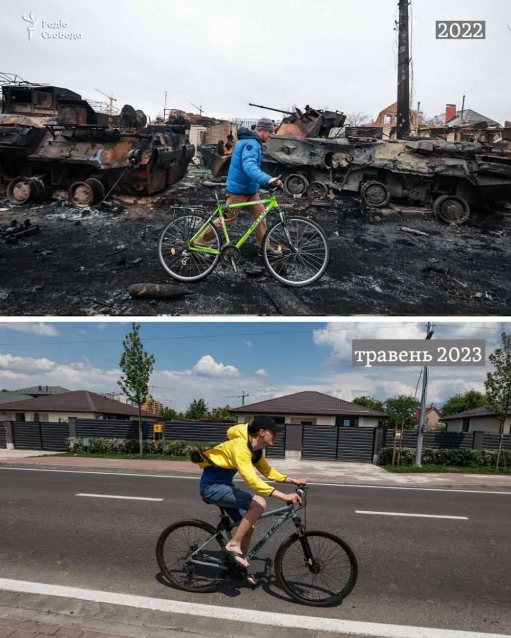 Одна из центральных улиц города 1 марта 2022 и новое шоссе в мае 2023 года (снизу).По официальным данным, более 2,5 тысяч сооружений повредили российские оккупанты в Буче. В общей сложности ущерб города составляет более 5 миллиардов гривен. В сентябре прошлого года городской голова Анатолий Федорук сообщал, что в городе снесут 372 частных дома и два многоэтажных. Они не подлежат восстановлению.1 марта 2022 года. Буча, улица Вокзальная. Именно по ней тридцатикилометровая колонна российской техники шла через весь город в Ирпень, а оттуда планировала идти в Киев, чтобы взять его за 3 дня. Снизу улица Вокзальная в Буче в мае 2023 года.Тогда этой колонне помешали добровольцы из Бучи, впоследствии ее уничтожили Вооруженные силы Украины.