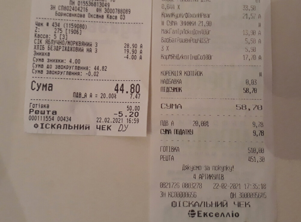 На этих двух чеках есть творог 9% жирности в упаковке 400 г за 43,9 гривен (4,07 руб.) и 5% жирности в упаковке 200 г — за 26,9 (2,49 руб.), купленные в разных магазинах. Это 10,2 руб. и 12,45 руб. за килограмм соответственно.