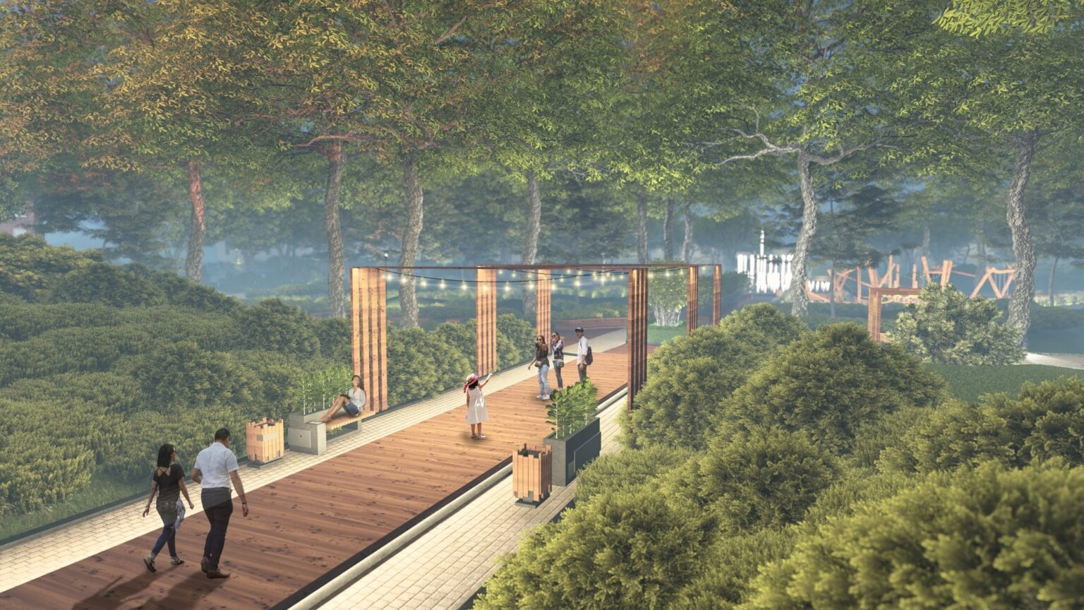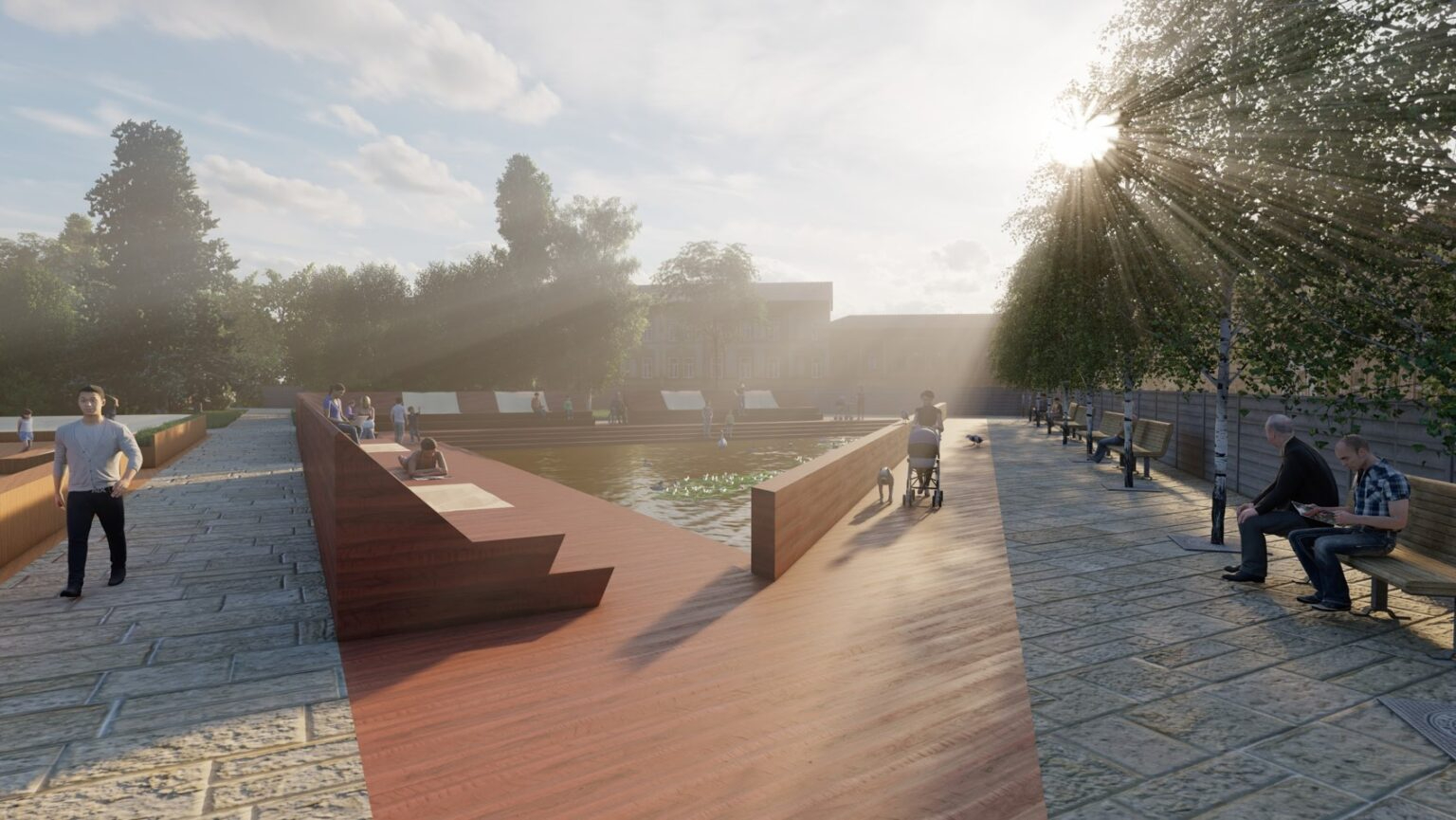 В проекте «Полесский сквер» конкурсанты предложили максимально сохранить существующее озеленение и создать комплексную благоустроенную среду для отдыха, спорта и социального взаимодействия. Для этого ребята разработали следующие зоны: галерея под открытым небом, зона с гамаками, коворкинг, кафе с летней верандой, водная зона, детская и спортивная площадки.