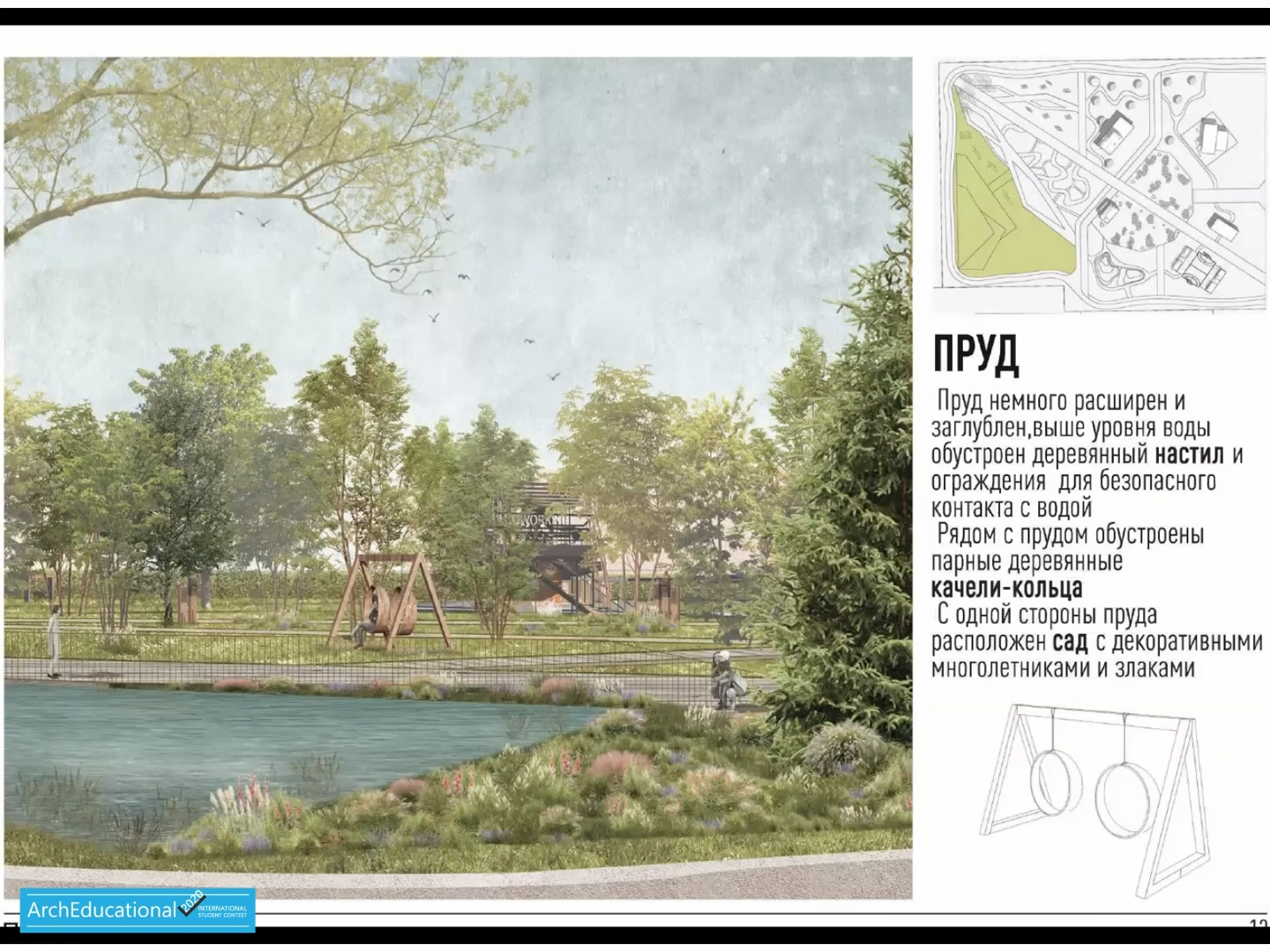 В первом проекте студенты выделили основные пешеходные маршруты, которые проложили люди, осталось их оформить в твердых покрытиях. В самом парке спроектировали несколько зон: бар, кафе, детская площадка, ярморочная зона, зеленая тропа, гамаки, парк скульптур и пруд.
