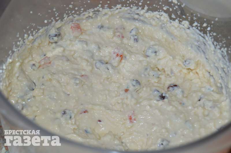 Надо: 350 г творога 9% жирности, 150 г жирной сметаны (от 20%), 2 сырых яичных желтка, 100 г сахара, 2 г ванилина, 100 г изюма, 100 г цукатов.