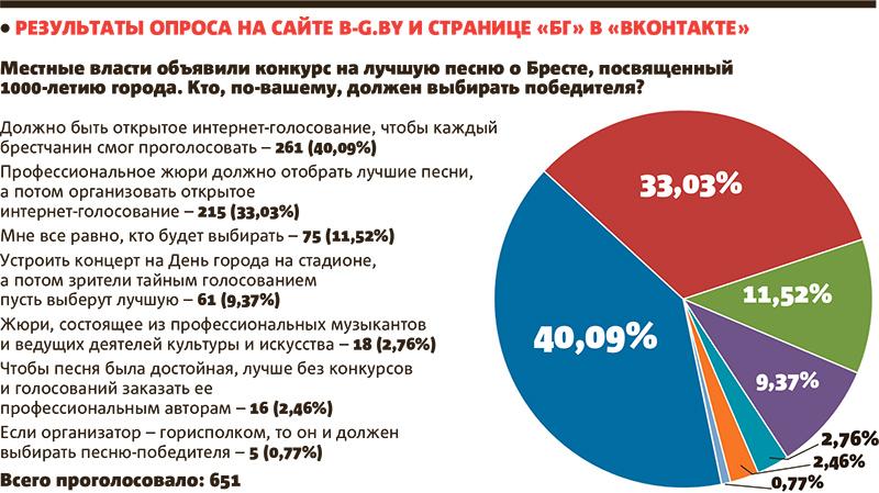 Кстати, состав жюри формируется из числа ведущих деятелей культуры и искусства и представителей Брестского горисполкома. Учитывать мнение брестчан, судя по условиям проекта, не собираются. В то же время около 40% участников опроса «БГ» сочли необходимым проведение открытого интернет-голосования с участием жителей Бреста. Около 35% респондентов считают, что сначала профессиональное жюри должно отобрать лучшие песни, а потом опять-таки нужно организовать открытое интернет-голосование.