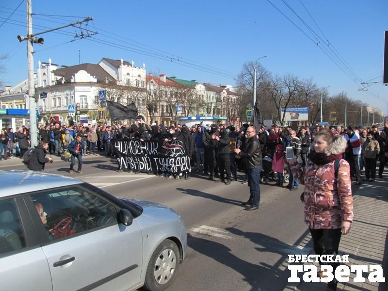 Участники акции идут по ул. Пушкинской. Маршрутки и другие машины сигналят. Повернули на Советскую. Начало колонны — у ТЦ «Дидас Персия», хвост — у «Белтелекома». Люди скандируют «Нет декрету №3», «Нет зарплаты, есть налог — депутату в кошелек», «Настоящий дармоед — тот, кто выдумал декрет» и хлопают, привлекая внимание прохожих.