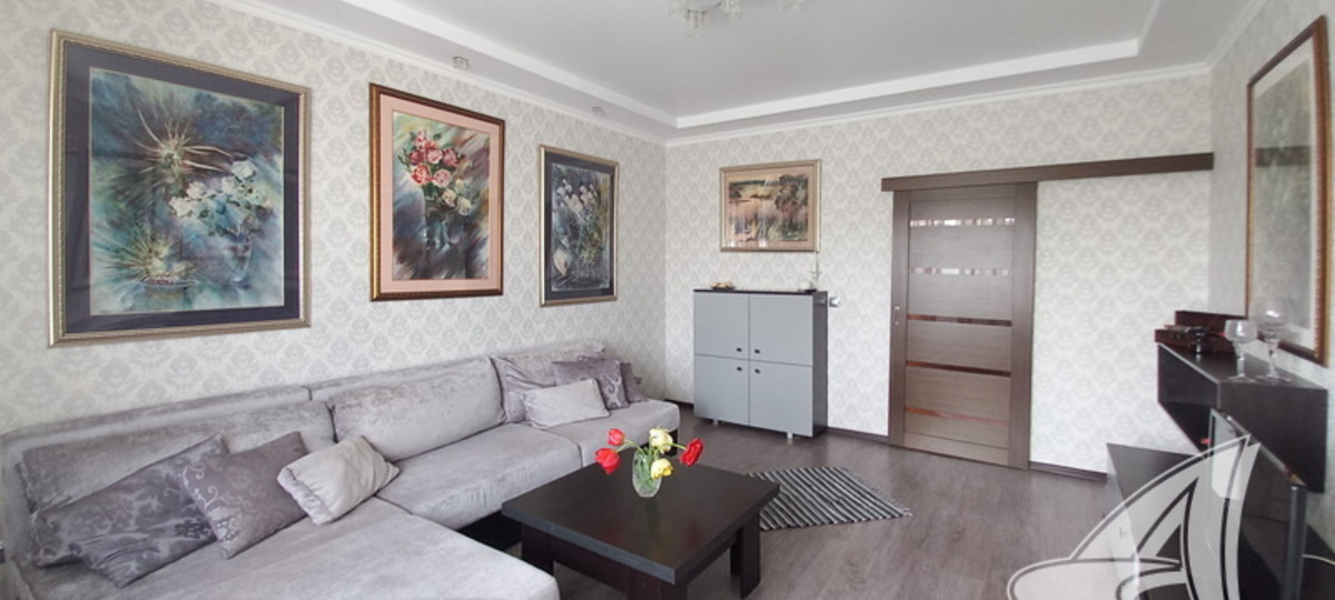 Квартира весьма уютная, несмотря на не совсем современный ремонт. На фоне однотонных стен выделяются двери и мебель контрастного оттенка, элементы декора и крупноформатные картины. Что касается тематики то, в основном, это какие-то натюрморты и пейзажи. Картины сосредоточены в зале, одной из спален и коридоре.