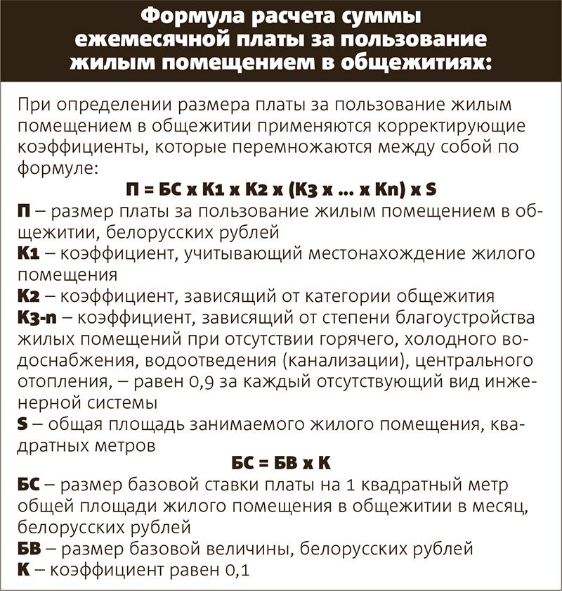 В инструкции приведена подробная формула исчисления тарифа, позволяющая жильцам общежитий самостоятельно вычислить, сколько стоит метр площади. Чтобы получить результат, необходимо базовую величину (сейчас 24,5 рубля — прим. авт.) умножить на несколько коэффициентов. Один из них равен 0,1, другой — зависит от местонахождения общежития. Самый высокий он для областного центра — 0,55, ниже всего — для сельских населенных пунктов (0,1).