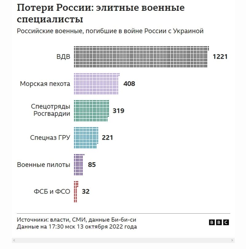 В одной только операции по неудачной обороне Лимана, как стало известно Би-би-си, погибло целое отделение спецназа ГРУ из Тольятти. Этот и другие элитные отряды российской армии и Росгвардии несут чувствительные потери в ходе войны на территории Украины, поскольку их систематически используют для решения несвойственных им задач. Например, разведчиков привлекают для досмотра и проверки улиц в захваченных населенных пунктах, а отряды Росгвардии — для общевойсковых боев и оборонительных действий.