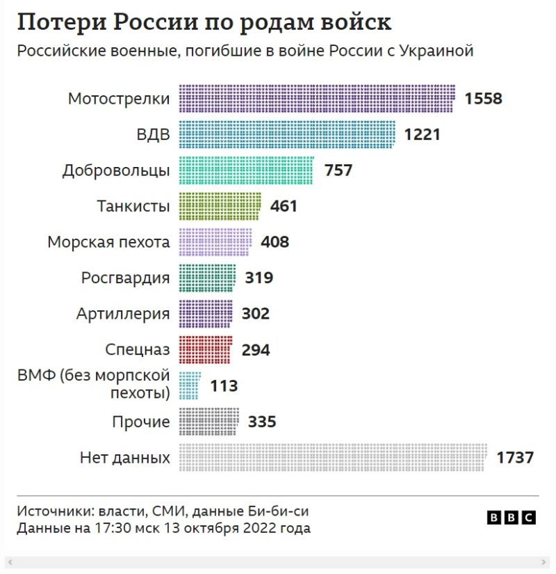 Русская служба Би-би-си ведет поименный список потерь российских военнослужащих в Украине совместно с изданием «Медиазона» (признано в России «СМИ-иноагентом») и командой волонтеров. На 14 октября им удалось подтвердить информацию о 7 502 погибших солдатах и офицерах.
