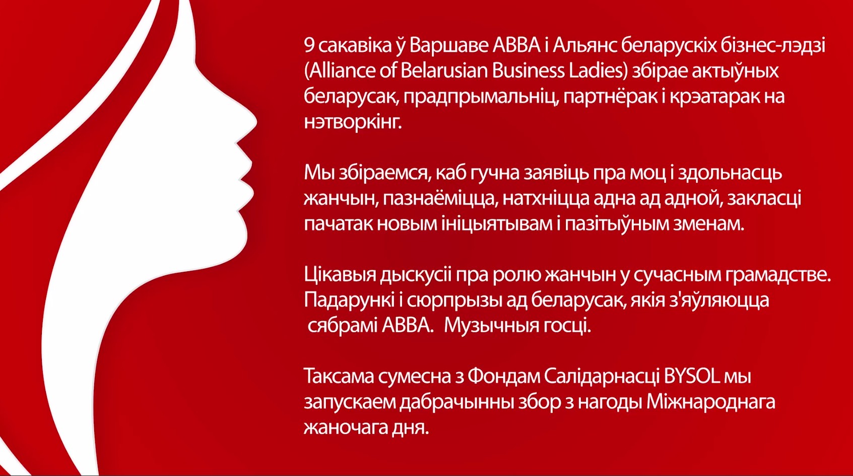 Специальная часть мероприятия в Spring Networking Business Ladies будет посвящена беларуским политзаключенным. АВВА совместно с BYSOL запустили благотворительный сбор по случаю Международного женского дня. Цель — собрать как можно больше средств для беларусок, которые сегодня находятся в заключении.