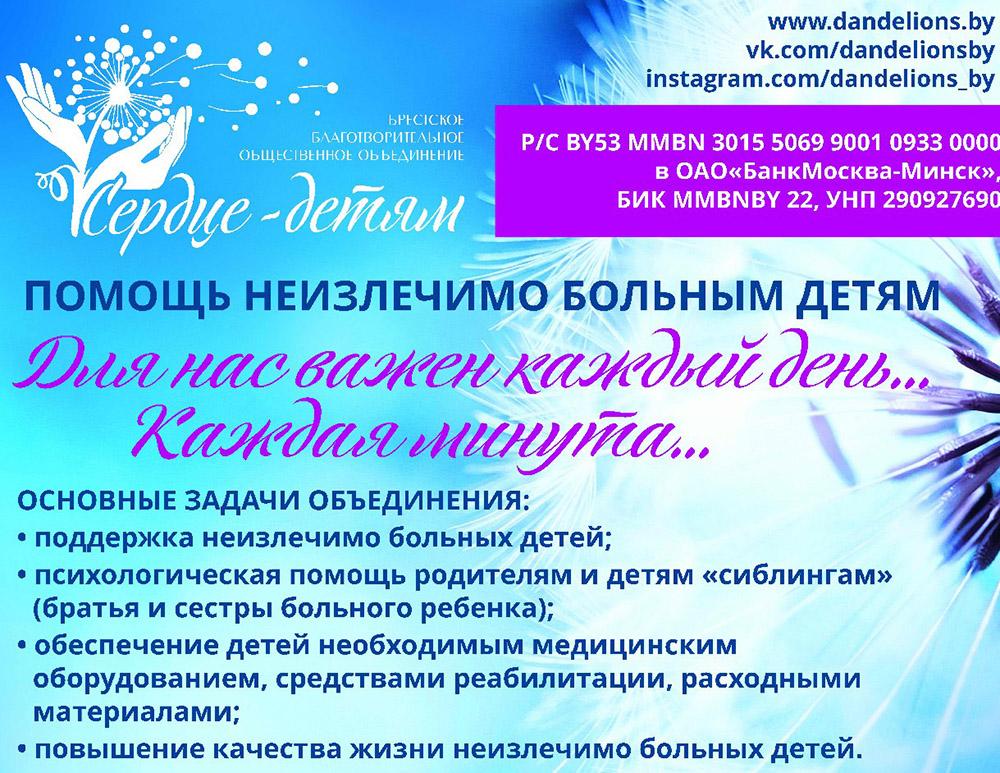 Расчетный счет Брестского благотворительного общественного объединения «Сердце — детям» BY53MMBN30155069900109330000 в ОАО «Банк Москва-Минск», БИК MMBNBY22, УНП 290927690