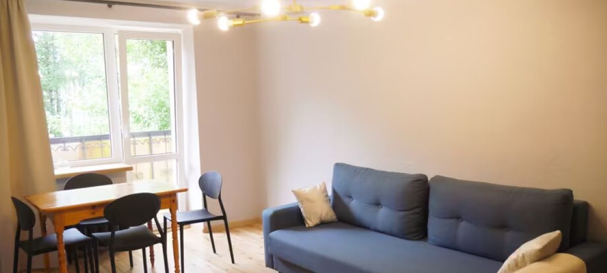 Вот так выглядит самая светлая из дешевых квартир, которую мы нашли. Довольно светлая отделка, немного мебели, большое окно в комнате и балкон. Бытовой техники нет.