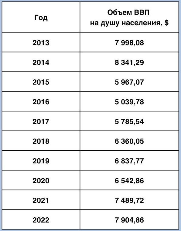 Как видим, динамика изменений ВВП на душу населения Беларуси с 2013 по 2022 год демонстрирует разнонаправленный характер изменений, а усредненный рост составляет 2,33% в год. В абсолютных значениях, максимальный прирост был зафиксирован в 2008 году — на +$1 640,7, а максимальное падение — в 2015, тогда показатель уменьшился на $2 374,22.