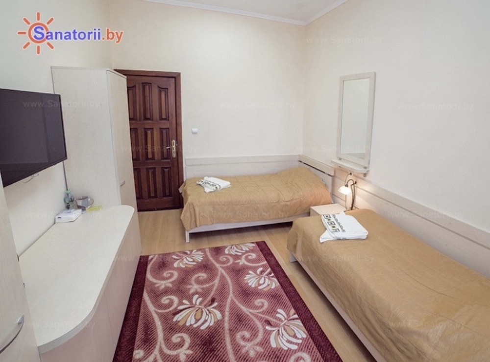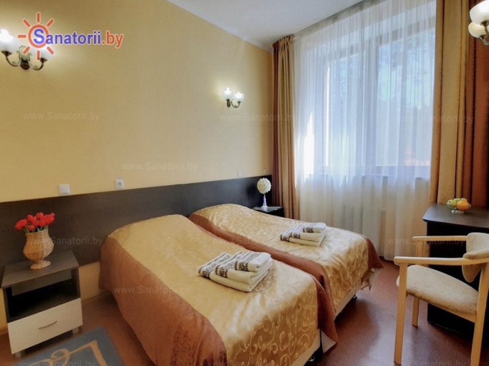 В здравницы среднего ценового сегмента — «Энергия» и «Чаборок» — мы нашли 14 путевок на 4 – 7 дней. В этой категории даже есть двухместные номера Luxe, где недельное проживание стоит 883,75 BYN. Вот как он выглядит.