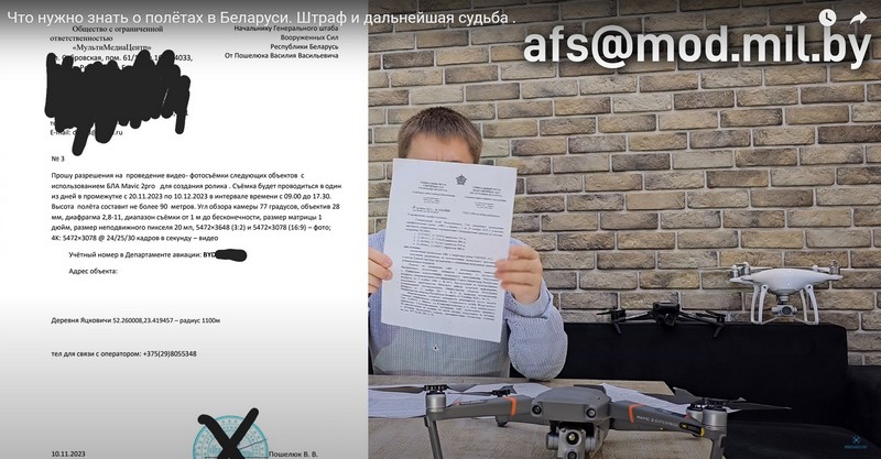 Пункт №6. После того, как вы прошли обучение, получили бортовой номер, разрешение на использование дрона, нужно написать электронное письмо в Генштаб Республики Беларусь и получить разрешение на аэросъемку. Адрес: afs@mod.mil.by.