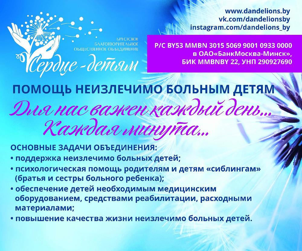 Помочь Анечке можно, перечислив деньги на расчетный счет Брестского благотворительного общественного объединения «Сердце — детям» BY53MMBN30155069900109330000 в ОАО «Банк Москва-Минск», БИК MMBNBY22, УНП 290927690