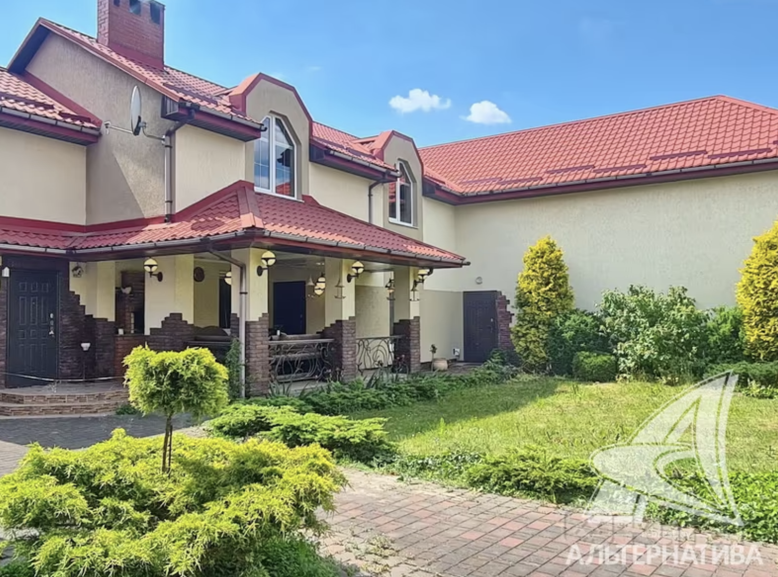 На участке выполнен ландшафтный дизайн, посажен фруктовый сад, есть беседки и гараж на 3 машины. К дому идут асфальтированные подъездные пути, а рядом есть остановка общественного транспорта.