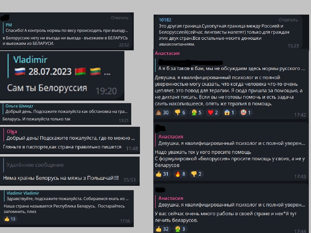 Некоторые пользователи чатов не стесняются писать, что не реагируют на сообщения, если видят «Белоруссию». А кто-то предлагает банить тех, кто пишет «Белоруссия» или даже «Белорусь».