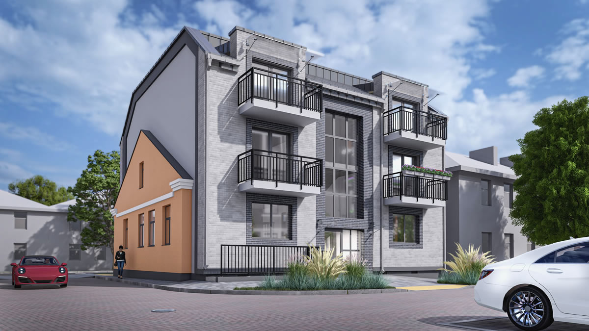 Второй дом, двухсекционный и четырехэтажный построят в глубине квартала. Здесь будет 23 квартиры. Высота этажа — 3 метра. Предусмотрели летние помещения: на 2-4 этаже будут балконы с металлическим ограждением, без остекленения, “французские” балконы. Также запроектированы лифты.