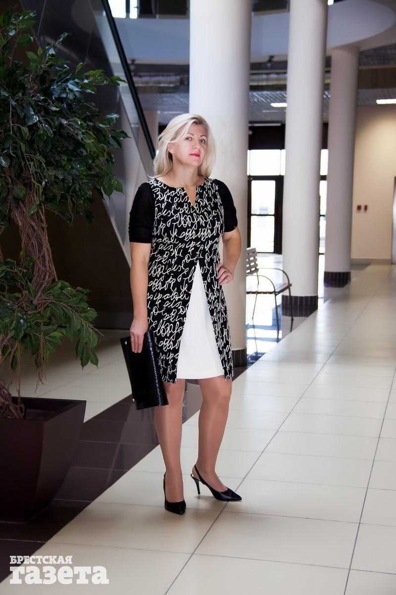 Интересное платье из жаккардового полотна с графичным рисунком-шрифтом оказалось в любимчиках у Людмилы. Перед платья состоит из двух вертикальных частей. В клинообразном вырезе кокетливо открывается нижний слой из светлого полотна.