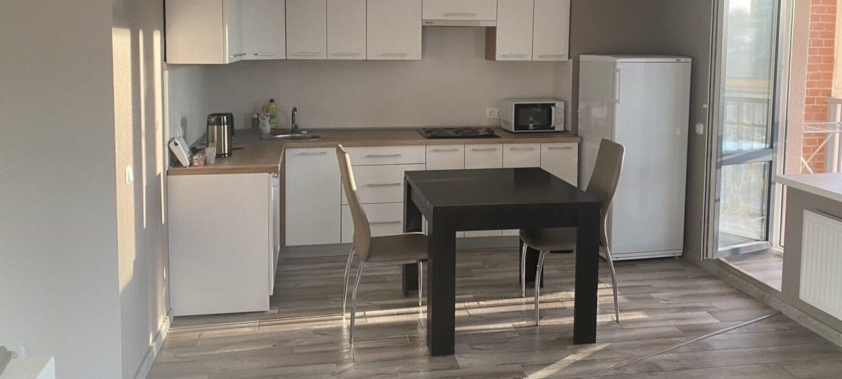 Квартира в бежевых тонах площадью 43 м² расположена в кирпичном доме 2019 года постройки. Есть застекленная лоджия, имеется посуда, СВЧ, стиральная машина, телевизор, высокоскоростной интернет, кондиционер. Заявлено и много других удобств: видеодомофон, сигнализация, благоустроенный двор, детская площадка, спортивный центр поблизости. Требуется предоплата за два месяца.