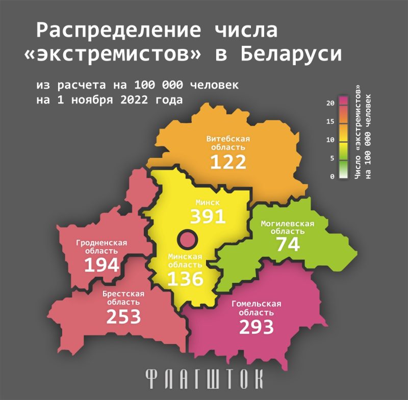 «Флагшток» 1 ноября 2022 года составил «экстремистский рейтинг» регионов Беларуси. Гомельская область заняла в нем первое место по числу «неблагонадежных» граждан на душу населения. Для составления рейтинга издание проанализировало «перечень лиц, причастных к экстремистской деятельности» МВД.