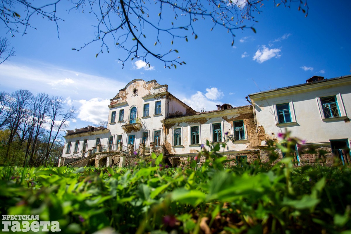Наш маршрут продолжился через город Высокое. Здесь мы посетили старинный парк, в котором сохранилась усадьба рода Сапег и руины въездной брамы в старый замок. Попасть к усадьбе у нас не получилось, территория вокруг здания обнесена высоким сплошным забором. Но селфи напротив брамы и фотографию усадьбы мы все же сделали.