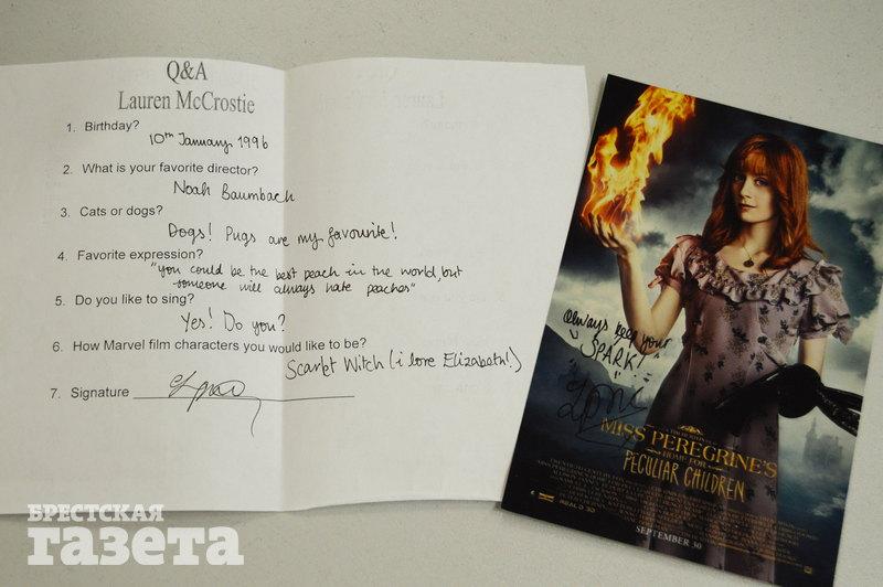 В ее коллекции есть также подписи белорусских звезд. Среди них Дарья Домрачева, Тео и Янина Малинчик. Актриса Брестского академического театра драмы снялась в российском фильме «Батальон», тем не менее очень удивилась, когда к ней подошли взять автограф, и даже рассказала об этом событии на своей странице в социальной сети Instagram.