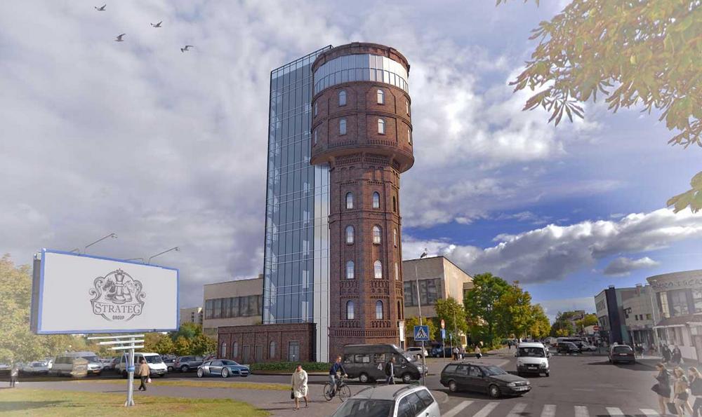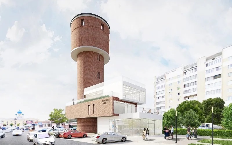 - реконструкция водонапорной башни под размещение кафе, торговых и административных помещений, с пристройкой стилобата в три этажа;